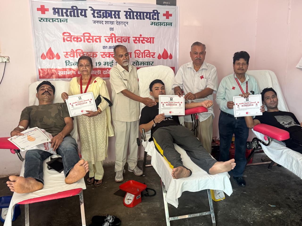 देहरादून। जिला रेडक्रॉस सोसायटी के तत्वावधान में यूथ रेडक्रास कमेटी की और से रायपुर स्थित समर्पित संस्था विकसित जीवन के प्रांगण में महंत इंदिरेश हॉस्पिटल ब्लड बैंक के सहयोग से आयोजित रक्तदान शिविर एवं सम्मान समारोह में कुल 28 ग्रामीण युवाओं ने रक्तदान किया। इस अवसर पर यूथ रेडक्रास के अनिल वर्मा को विकसित जीवन-रक्त भूषण अवार्ड से सम्मानित किया गया।